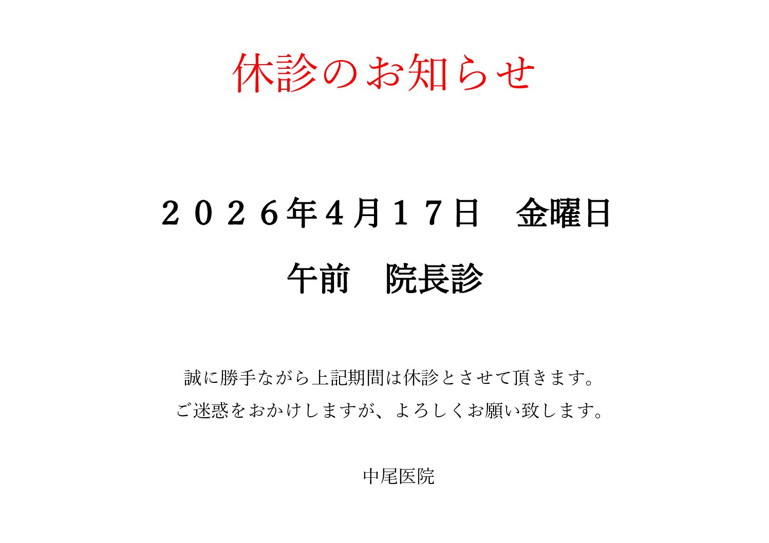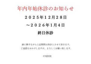 休診・代診情報 2025 10/17 未分類 2024年3月4日 2025年10月17日 2025年4月17日 午前 院長診 誠に勝手ながら休診とさせて頂きます。 ご迷惑をおかけしますがよろしくお願い致します。 未分類 年末年始休診のお知らせ この記事を書いた人 nakao おすすめ記事 年末年始休診のお知らせ 2025年10月17日